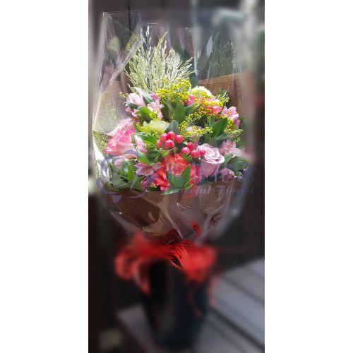 11枝精選紫色玫瑰,紅豆和時令小百合,當季襯葉及時令伴花伴草