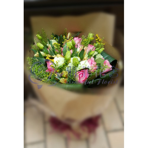 9枝當季粉紅玫瑰和桔梗, 當季襯葉及時令伴花