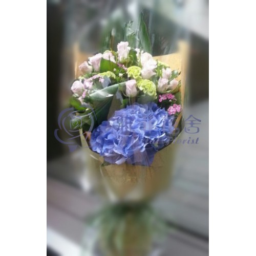當季繡球花和8枝精選粉紅玫瑰, 當季襯葉,及時令伴花