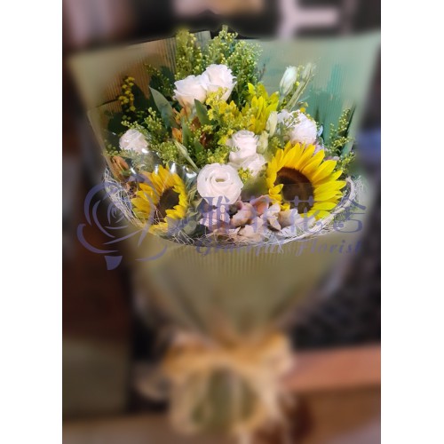 3枝太陽花和6枝精選白色玫瑰,當季襯葉及時令伴花