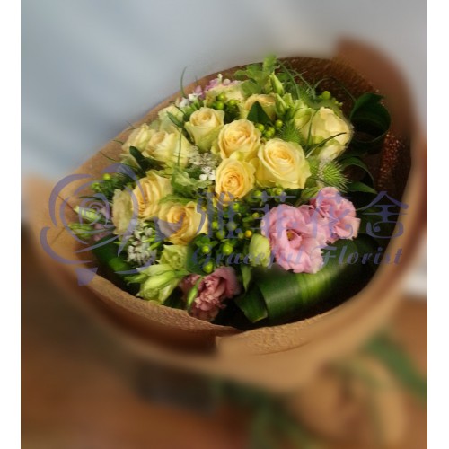 12枝黃色玫瑰和桔梗,當季襯葉及伴花