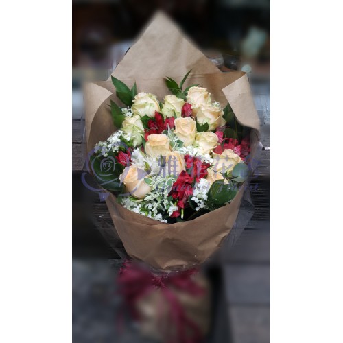 12枝當季香檳玫瑰和時令小百合當季襯葉及時令伴花